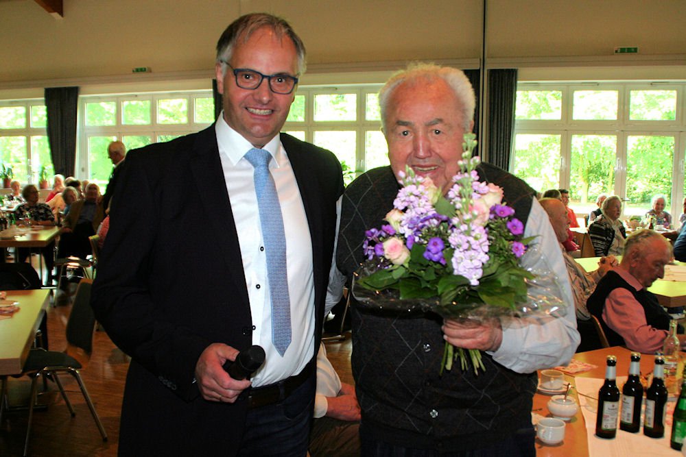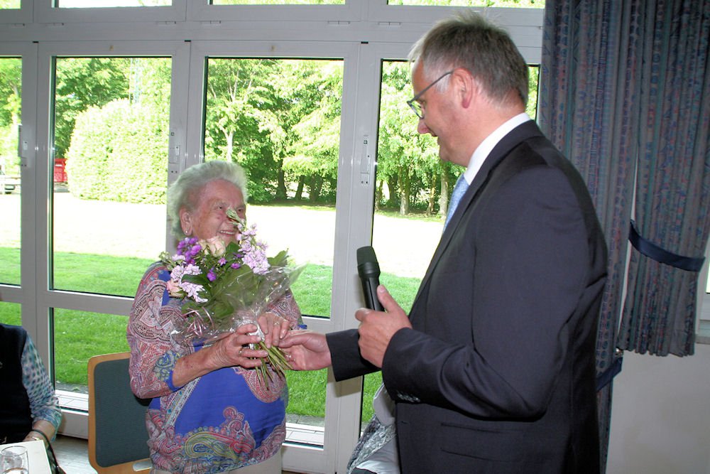 Der Vorsitzende des Heimatverein Boke, Paul Bentler (re.), ehrt die älteste Teilnehmerin des Seniorennachmittags Maria-Käthe Ludwig (li.) mit einem Blumenstrauß.