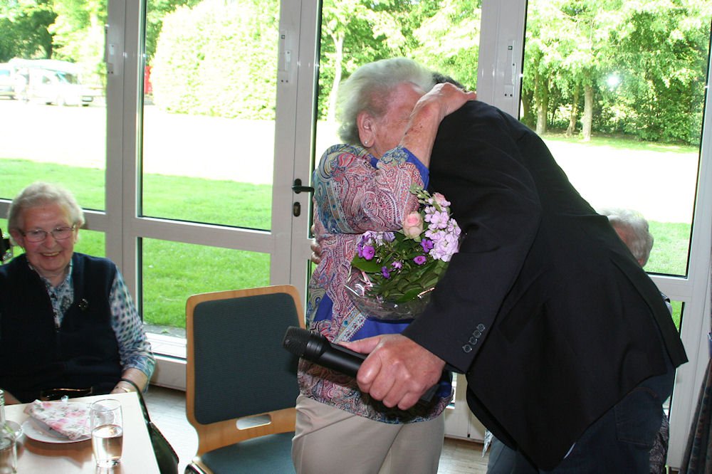 Mit Spannung wurde zum Ende des Seniorennachmittags die Ehrung der ältesten Teilnehmerin und des ältesten Teilnhmers erwartet. Mit einem Blumenstrauß aus der Hand von Paul Bentler wurden die Seniorin Maria-Käthe Ludwig und der Senior Pfarrer i. R. Josef Werth gehrt.