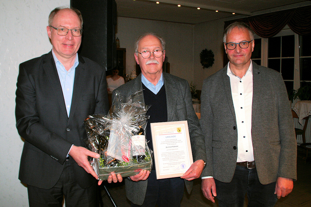 Stellvertretender Vorsitzender Klaus Troja (li.) bedankt sich mit einem Präsent bei Ortsheimatpfleger Bernhard Kößmeier (mi.). Nach 48 Jahren Vorstandarbeit übergibt er sein Amt in andere Hände. Vorsitzender Paul Bentler (re.) mit der Ernennungsurkunde für Bernhard Kößmeier zum Ehrenmitglied.