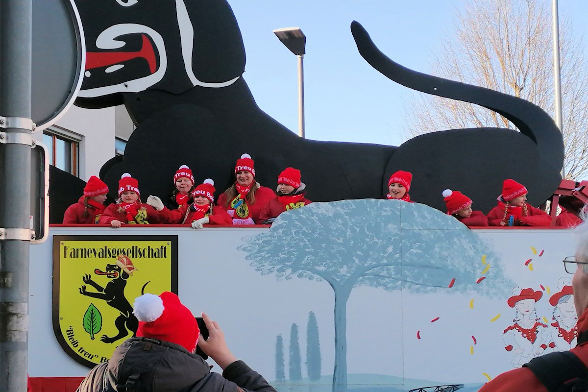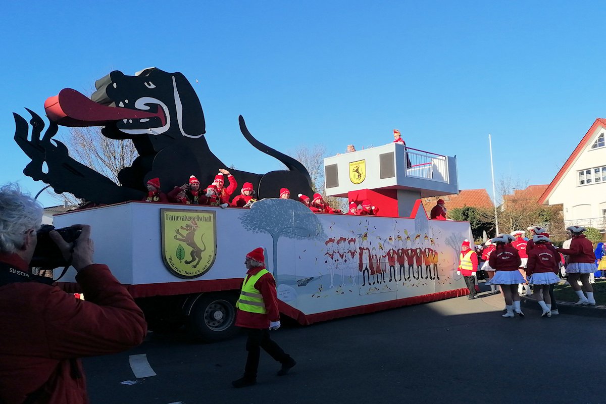 In beiden Karnevalszügen zog der imposante Prinzenwagen der Karnevalsgesellschft "Bleib Treu" Boke besondere Blicke auf sich. Eine überlebensgroße Figur des Boker Bracken, das Wappentier im Boker Wappen, begrüßte die Närrinnen und Narren.