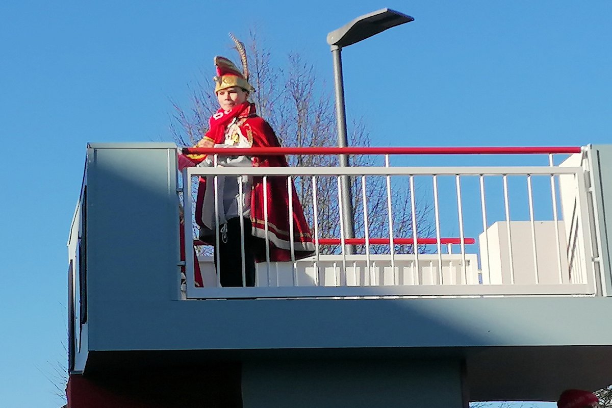 Beim Kinderzug am Sonntag grüßte von der Brücke im hinteren Bereich des Prinzenwagens das amtierende Kinderprinzenpaar Evelyn I. Jungmann und Damian I. Jakobi.