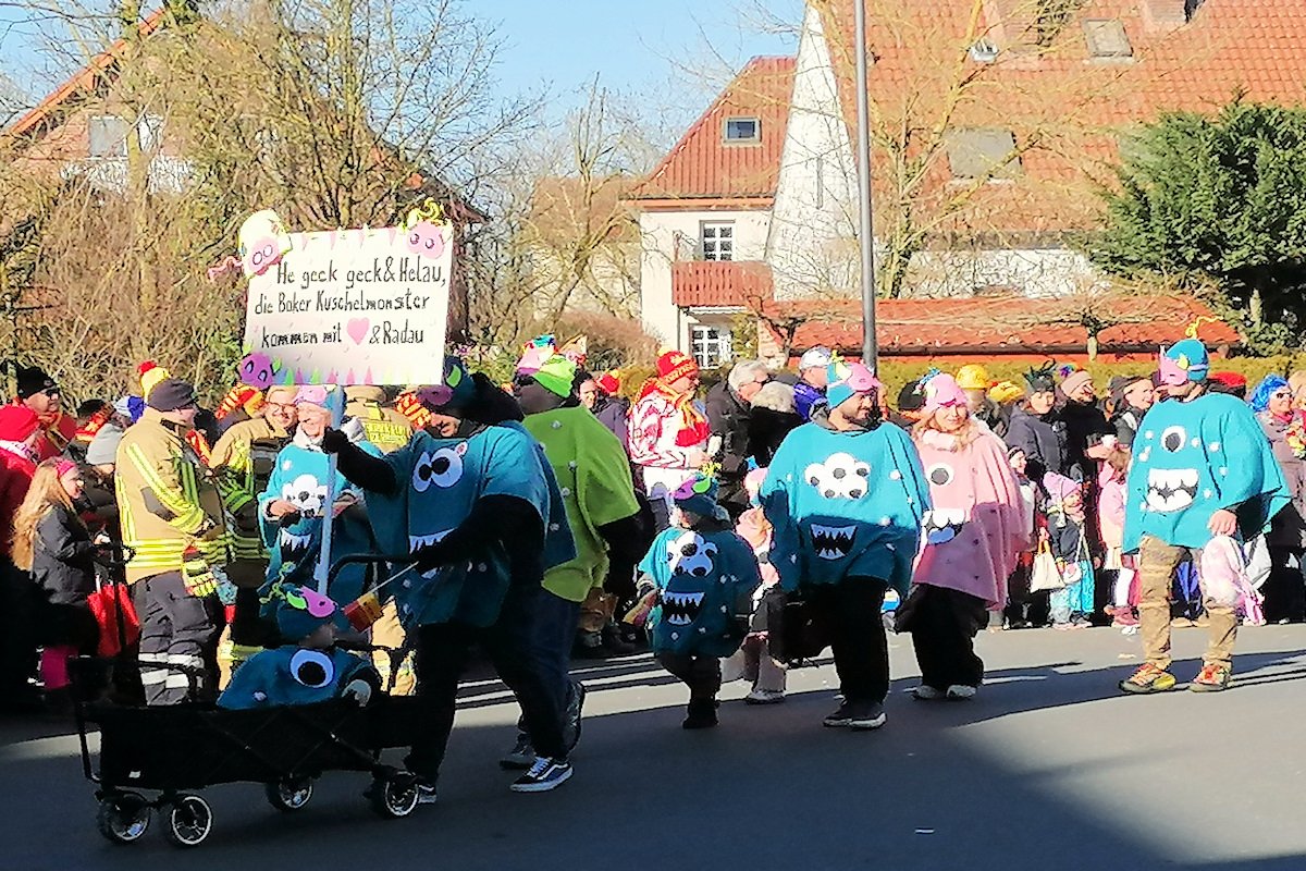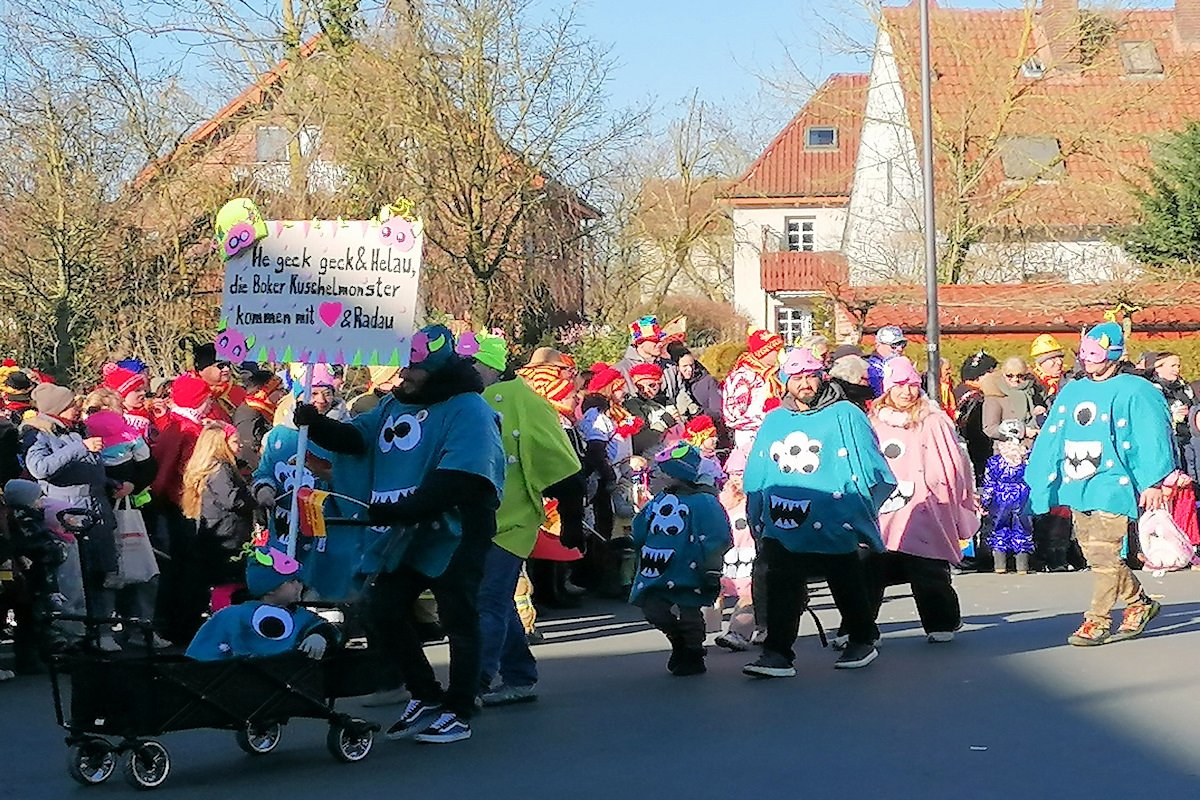Die Kita Lippenest nahm am Kinderzug mit dem Thema "Kuschelmonster" teil. Die "Kuschelmonster" begrüßten die Karnevalsjecken mit dem Spruch "He geck geck & Helau, die Boker Kuschelmonster kommen mit❤& Radau". Die Zugteilnehmer trugen einen blauen oder gelben Umhang mit einem furchteregenden Gebiss und großen Augen. Eine Gesichtsmaske mit Ohren und eine gleichfarbige Mütze ergänzten das Kostum.
